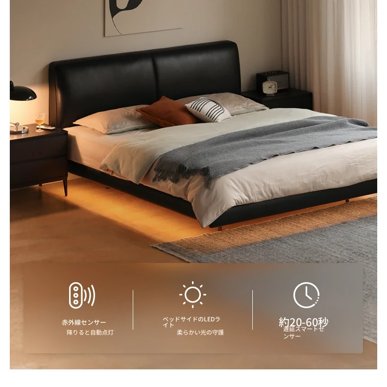 源氏木语の本革ベッド - イタリアンラグジュアリーの最高級牛革ソファベッド!スタイリッシュな浮遊感が魅力的な大黒牛2人用ベッド。快適さとデザインが融合した理想的な寝室のために。