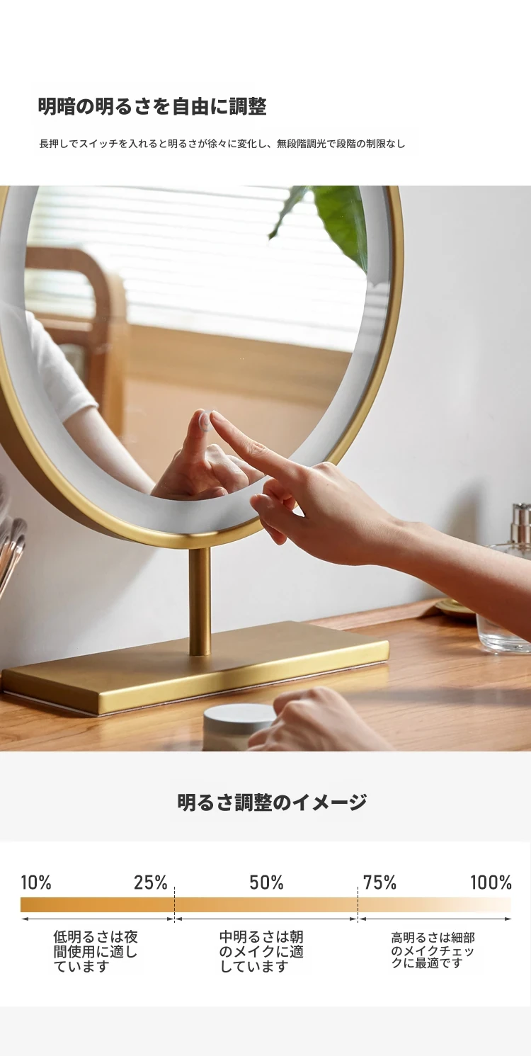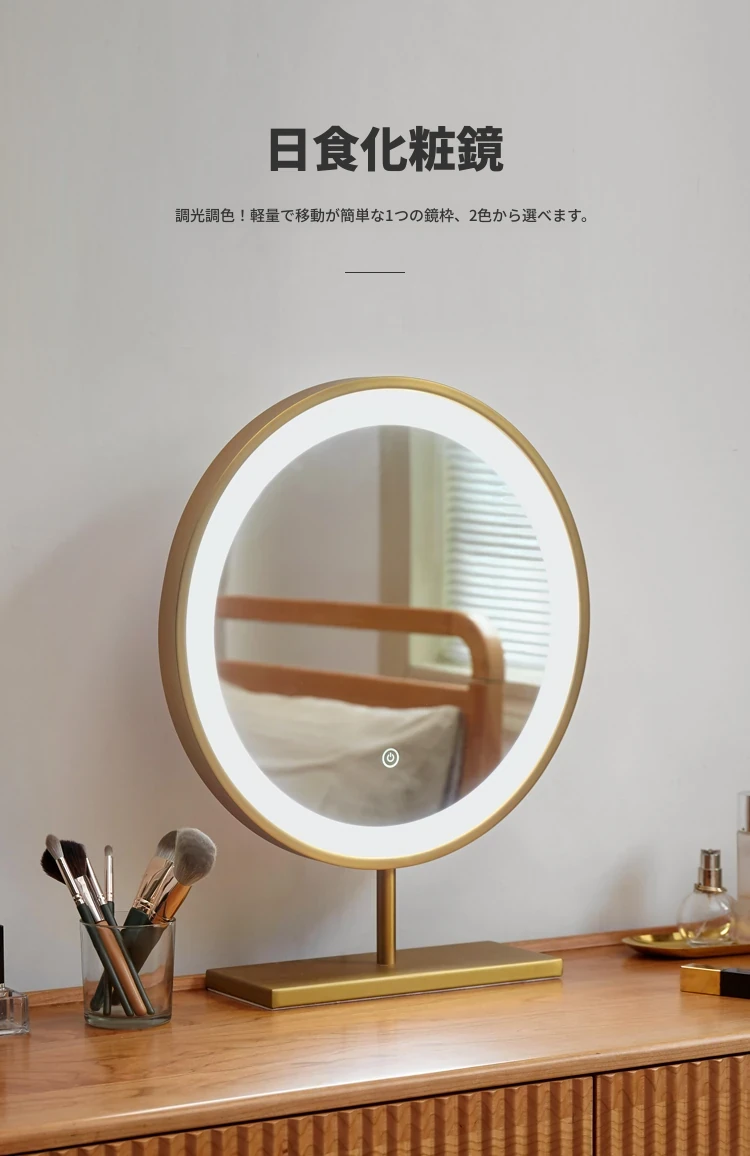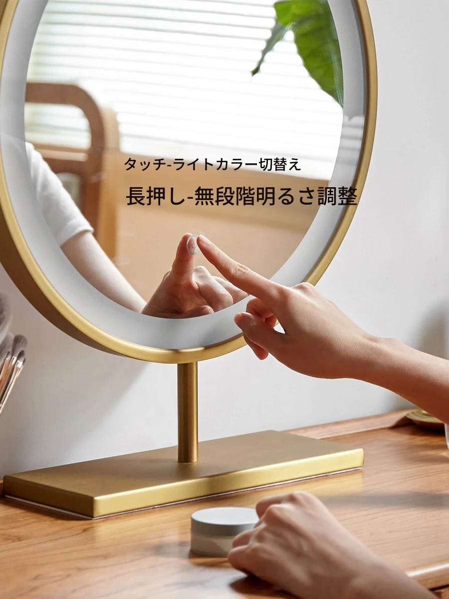 源氏木语のラグジュアリーな卓上化粧鏡 - LEDライト付きの円形メイクアップミラーで、家庭での美しさを引き立てるアイテム!おしゃれなデザインで、毎日のメイクをもっと楽しく!