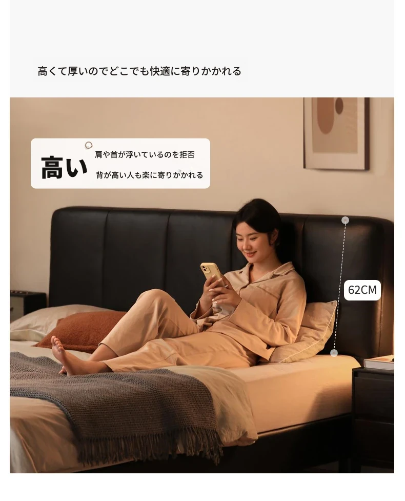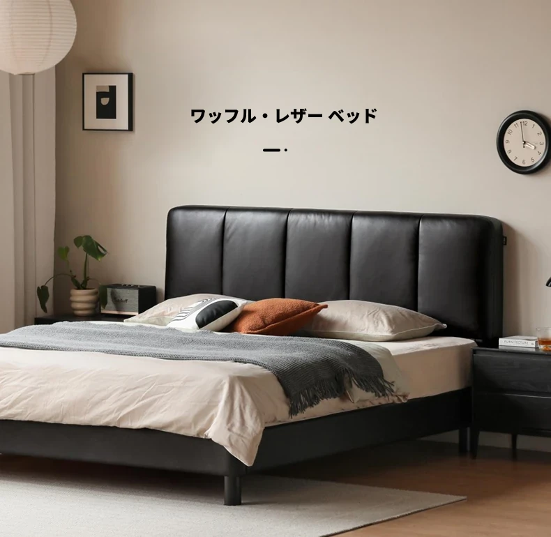 ゲンシムクユの本革ベッド - 高級感溢れるモダンデザイン!ダブルサイズ、柔らかなヘッドボード、耐久性のあるトップレザー使用。シックなブラックカラーで、快適な眠りをサポートします。あなたの寝室にぴったりのアイテムです!