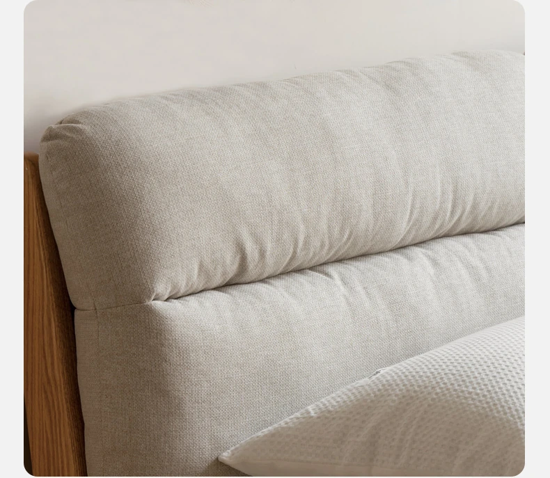 源氏木語の天然木ベッド - クリーム風デザインの寝室家具、ソフトパッキング付きダブルベッド。シンプルでモダンな無垢材の背もたれで、くつろぎの空間を演出します。
