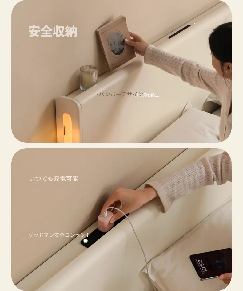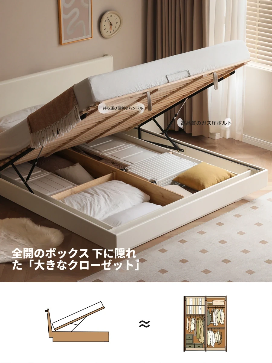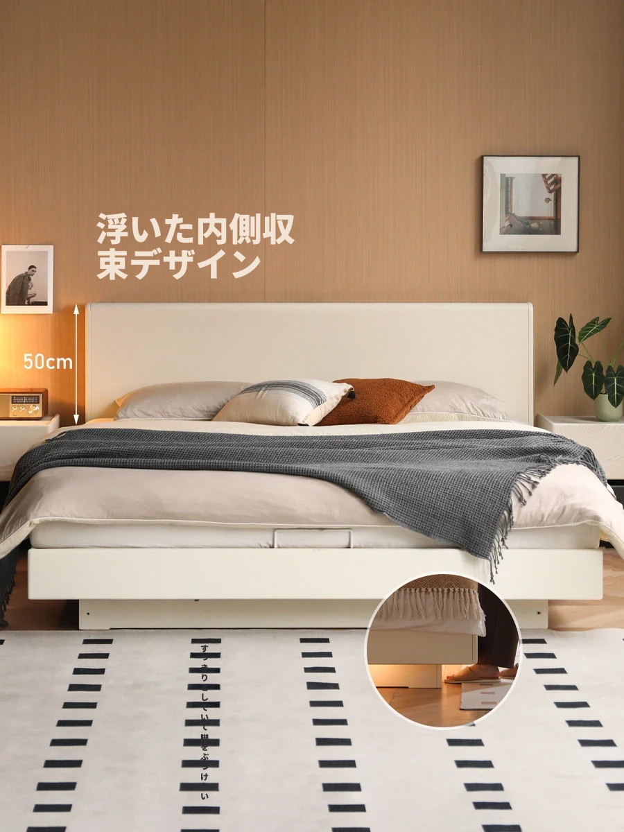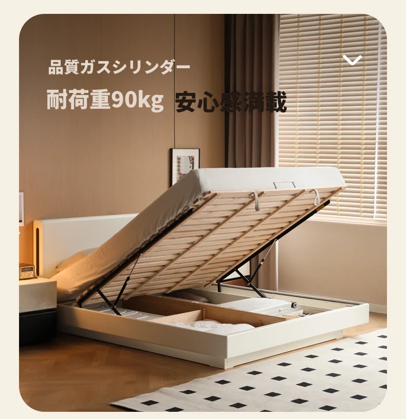 Genji Wood Solid Wood Bed - Minimalist Cream Style Storage Bed with Gas Lift, Night Light, and Floating Design in White. Perfect for Modern Homes!