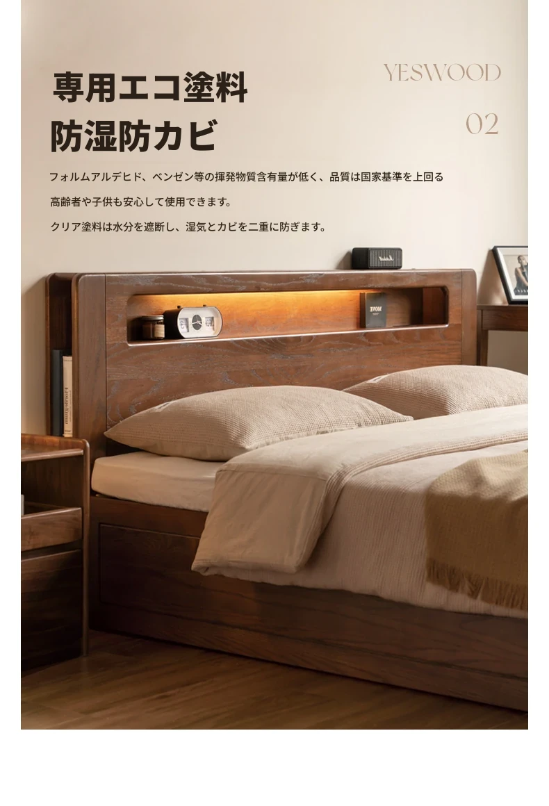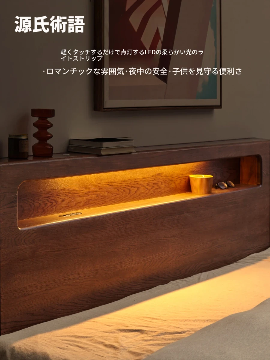 源氏木语の無垢材ベッド - モダンでシンプルなオーク材使用、1.5m/1.8mサイズの収納ボックス付き、北欧スタイルのダブルベッドで、快適な寝室空間を実現!