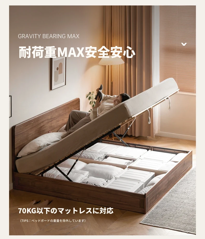 (7)低床ウォールナット(底板なし)ボックスベッド+マットレス(厚さ22CM J56 硬めH2)K35B32