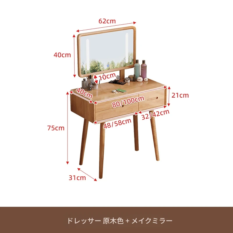 モダンでシンプルなデザインの無垢材ドレッサー収納キャビネット、メイクミラー付き。小型の寝室や書斎にぴったりなコンパクトなベッドサイドキャビネット。おしゃれなインテリアの必需品!