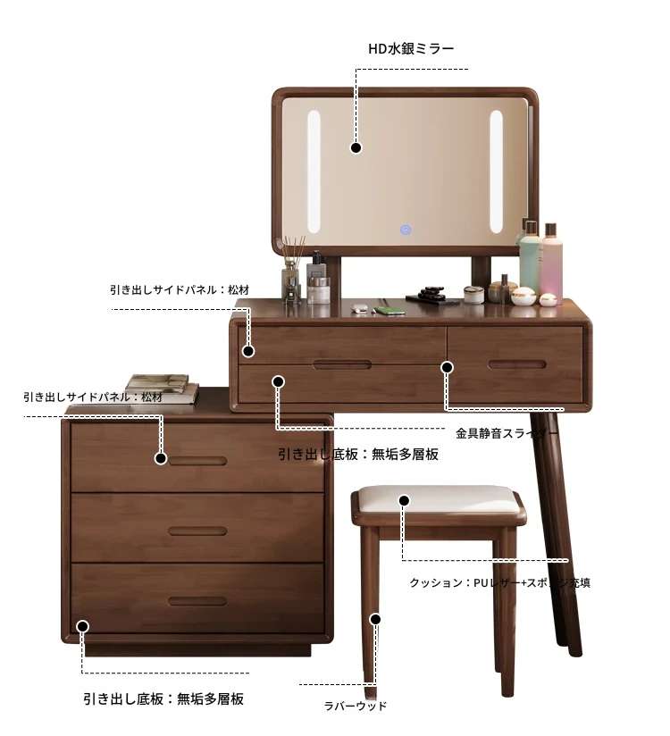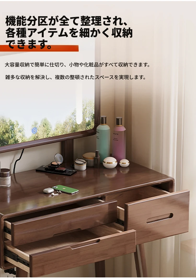 伸縮式角度実木化粧台&3段チェスト一体型 鏡付きメイクテーブル ベッドサイド収納に最適なコンパクトなデザインで、あなたの寝室をオシャレに演出!