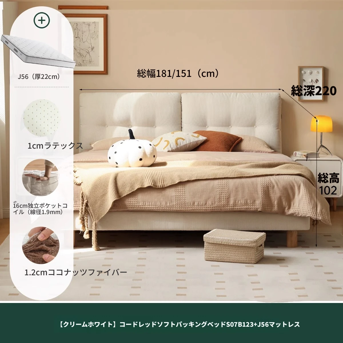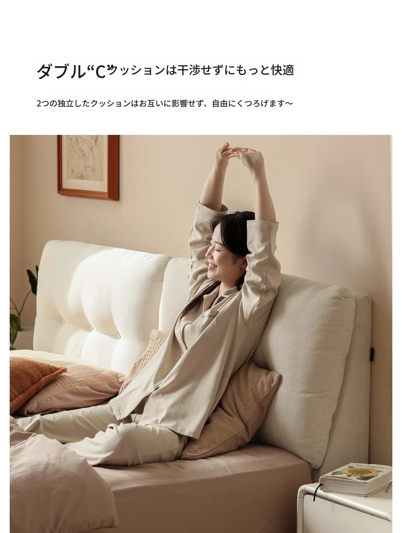 源氏木語の布製ベッド - クリームタイプのシンプルでスタイリッシュな寝室用ソファベッド!快適な背もたれと広々としたダブルベッド、理想の眠り空間を実現します。