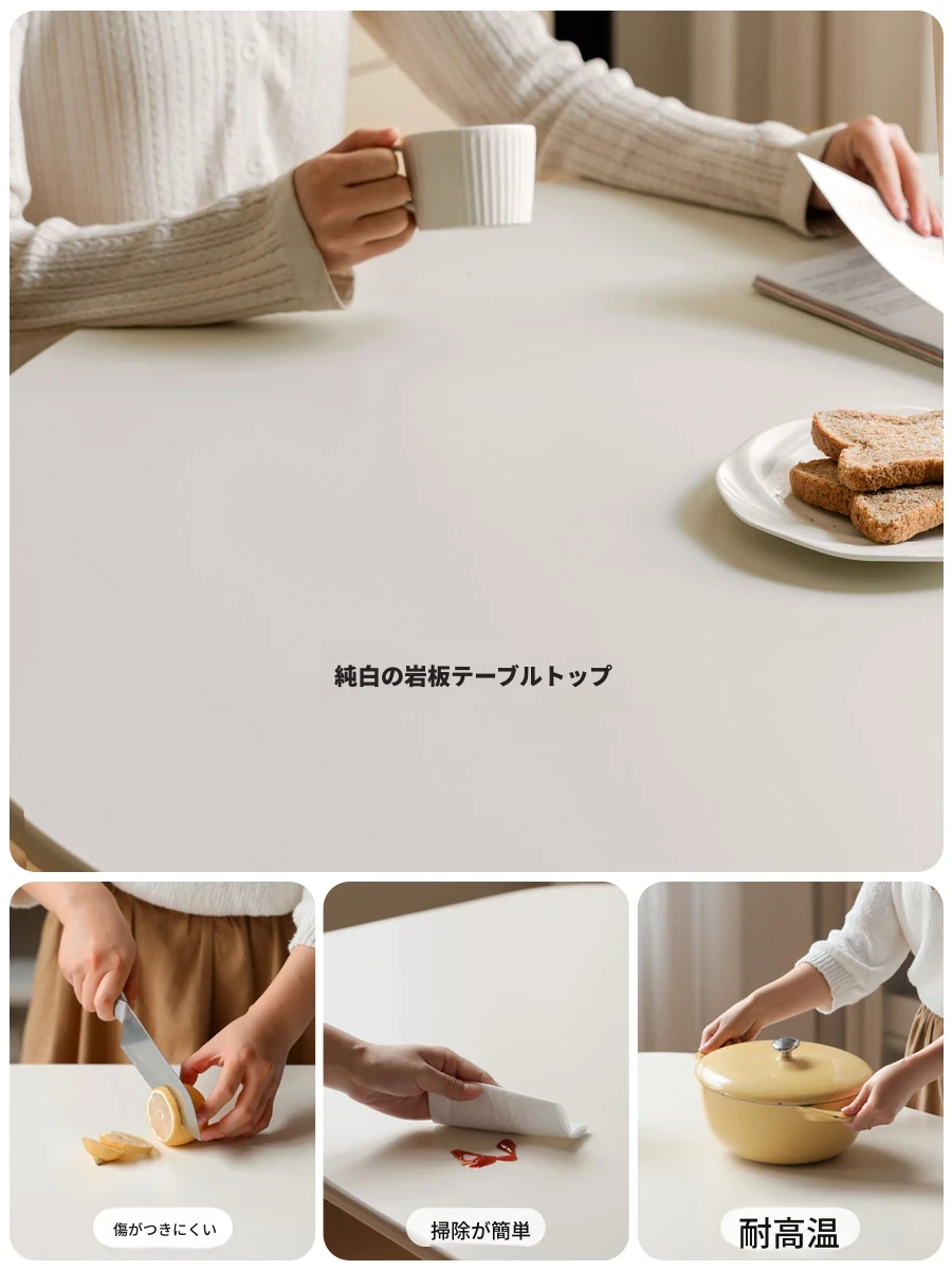 源氏木語の無垢材使用!おしゃれなフランス風クリームカラーのラウンドダイニングテーブル。小さなお部屋にもぴったりなオーク材の白い食卓。おしゃれで機能的な空間を実現します!