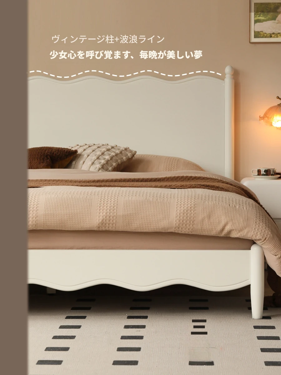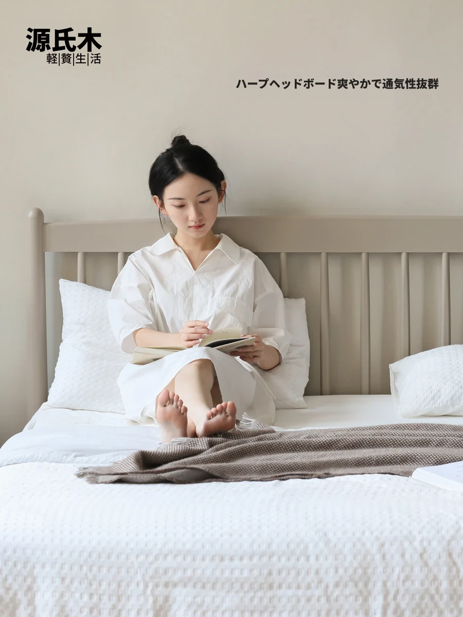 源氏木语無垢材のフレンチクリーム風ダブルベッド、シンプルで洗練されたホワイトデザイン、1.8メートルの大きな板ベッドで、あなたの寝室を優雅に彩ります。