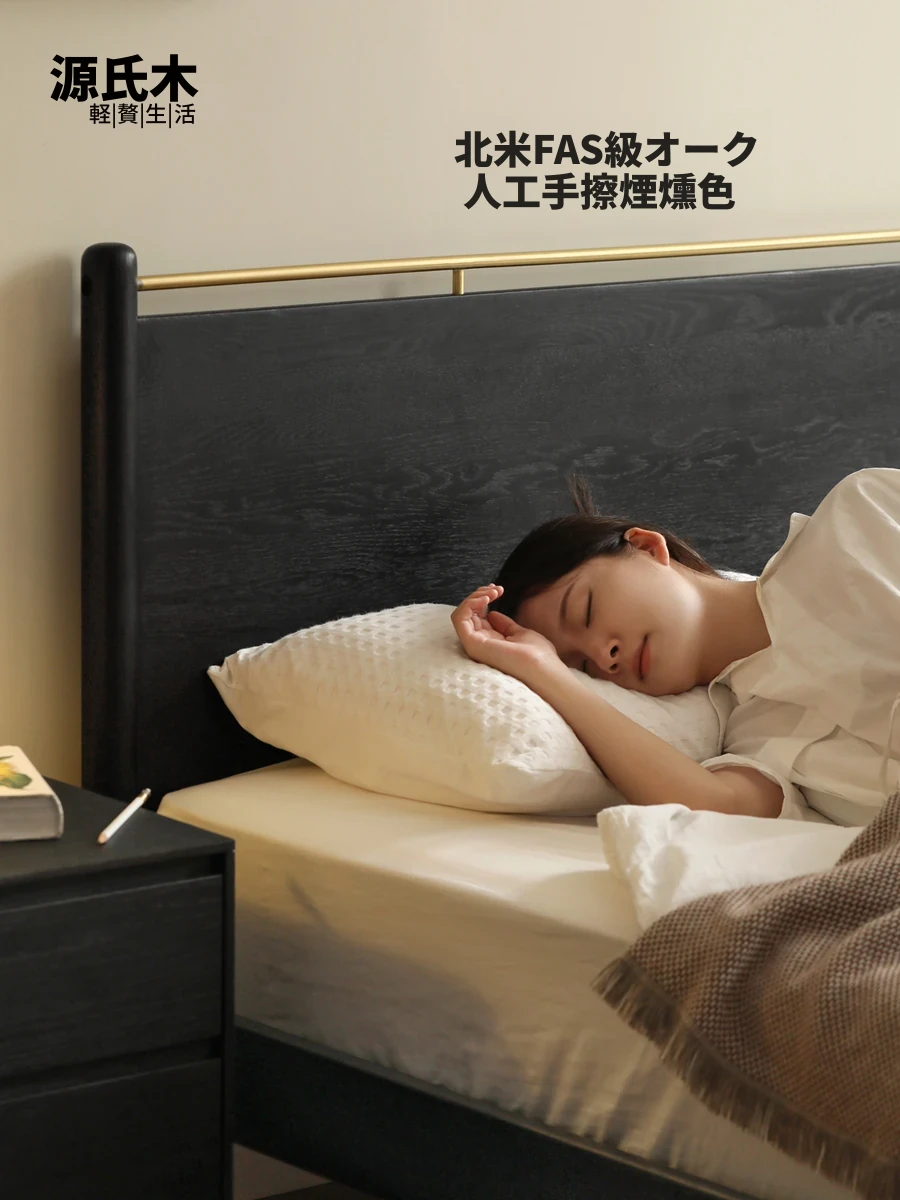 源氏木语 現代シンプルデザインのアメリカンスタイル無垢材ダブルベッド - オーク材ヘッドボード付き収納ベッドで、スタイリッシュな寝室を実現!