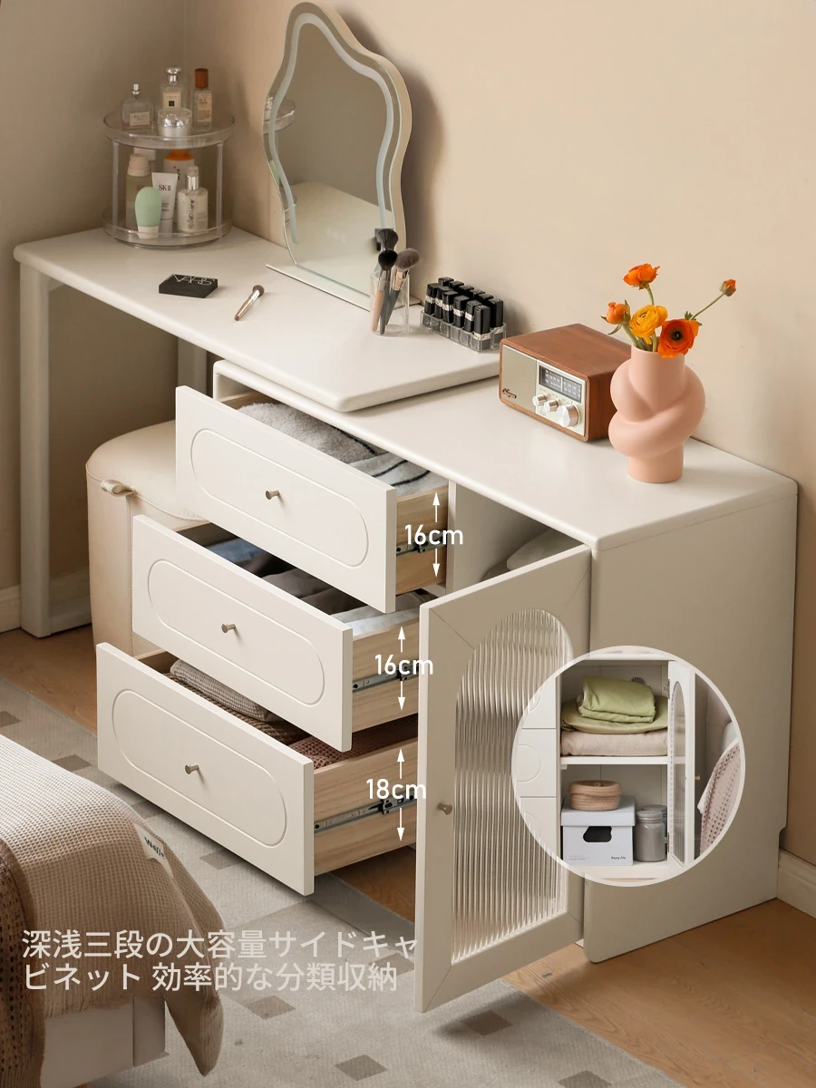 源氏木语の天然木製伸縮式ドレッサー - シンプルで洗練されたデザイン、収納力抜群の化粧台とキャビネットが一体化した現代的な家具。あなたの寝室を優雅に演出し、毎日のビューティータイムを特別に!